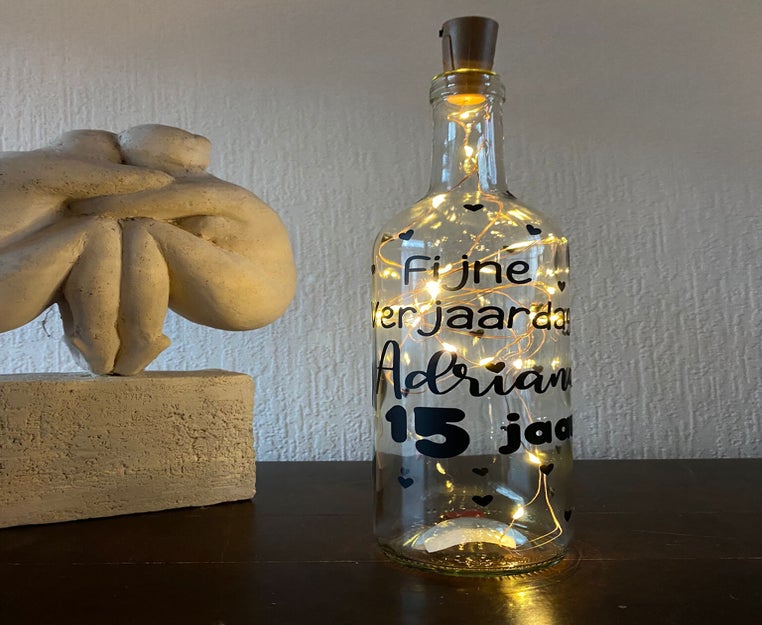 Belangrijk om te weten: Er heeft in deze lichtflessen géén wijn gezeten en dus zal er ook geen schimmel in komen! In iedere lichtfles zit een lichtsnoer met 20 ledlampjes. De tekst wordt standaard in zwart uitgesneden omdat dit het beste zichtbaar is. Wilt u echter een andere kleur, dan is dat geen enkel probleem. U dient dit enkel aan te geven.