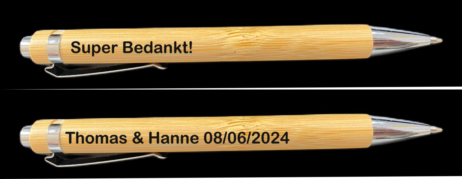 Deze houten pennen worden voorzien van tekst naar keuze.