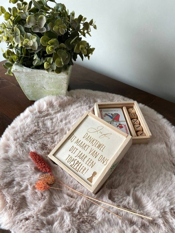 Houten doos met Spellenset met tekst