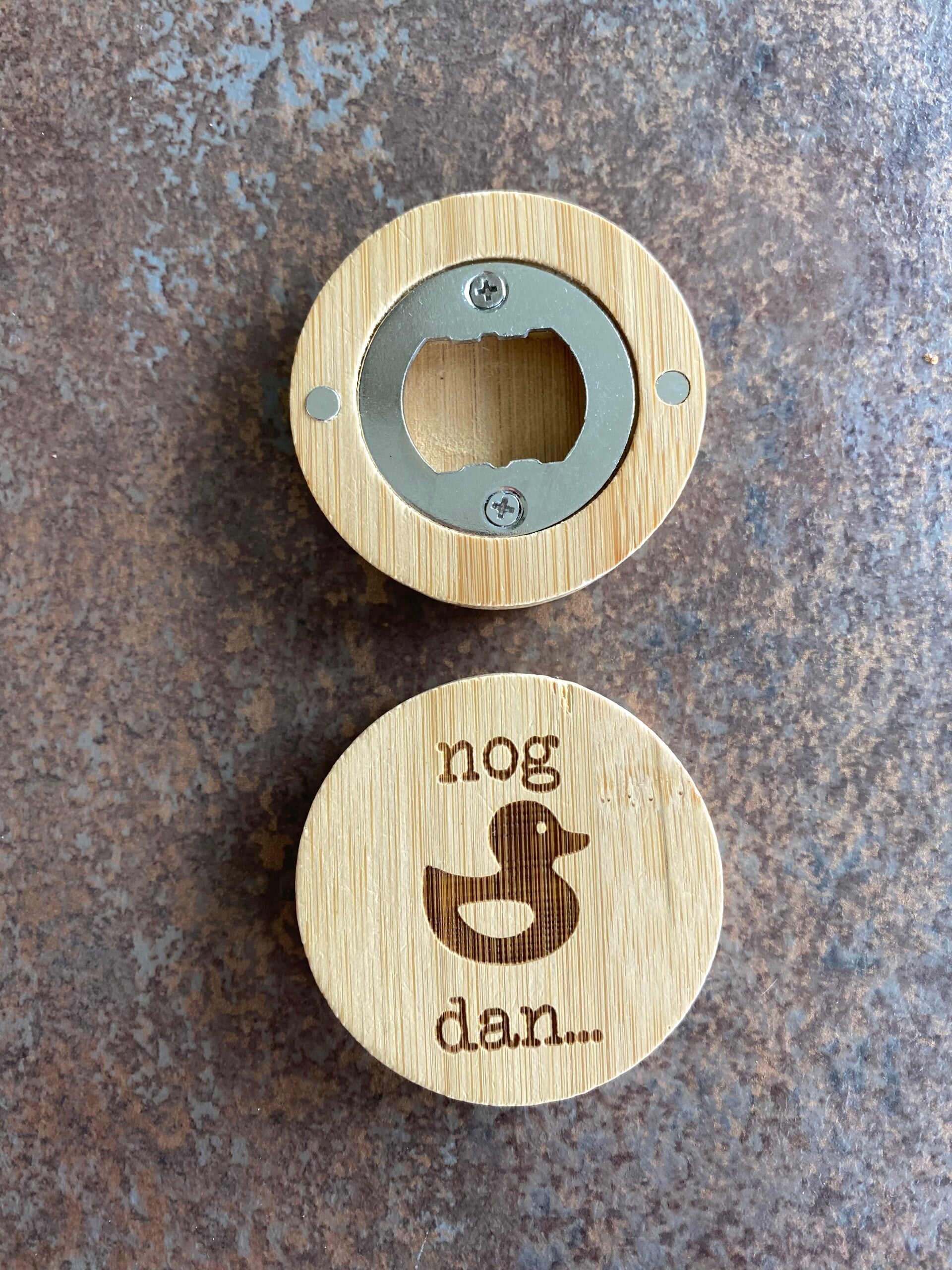 Houten ronde flesopener met naam tekst