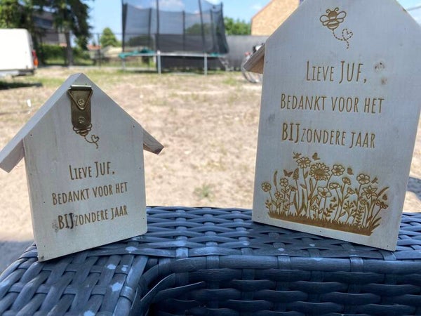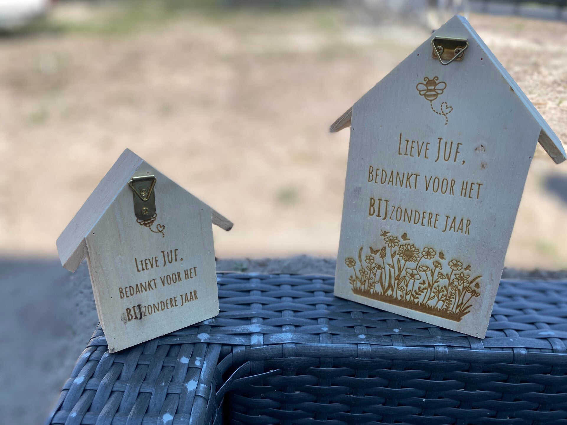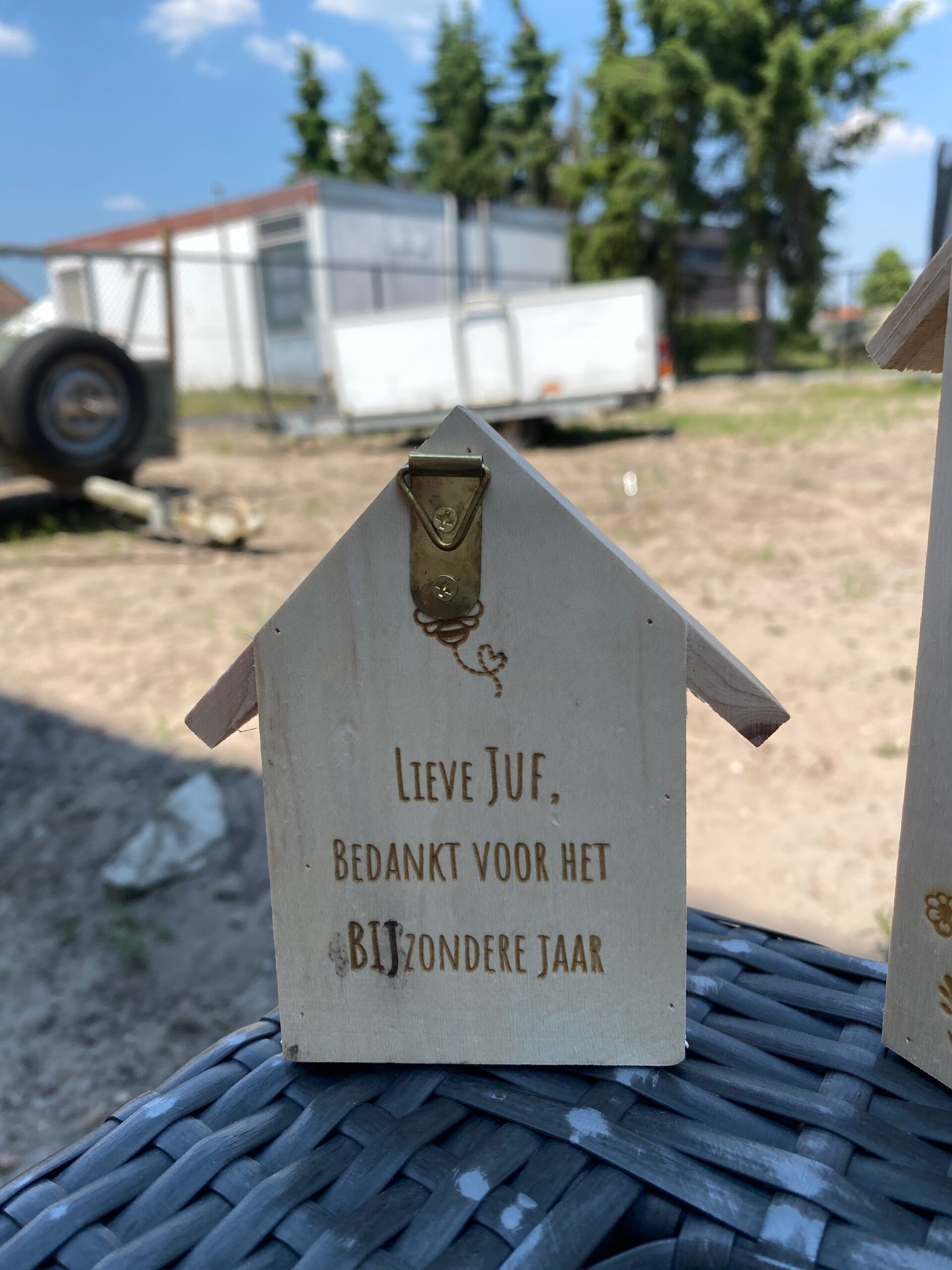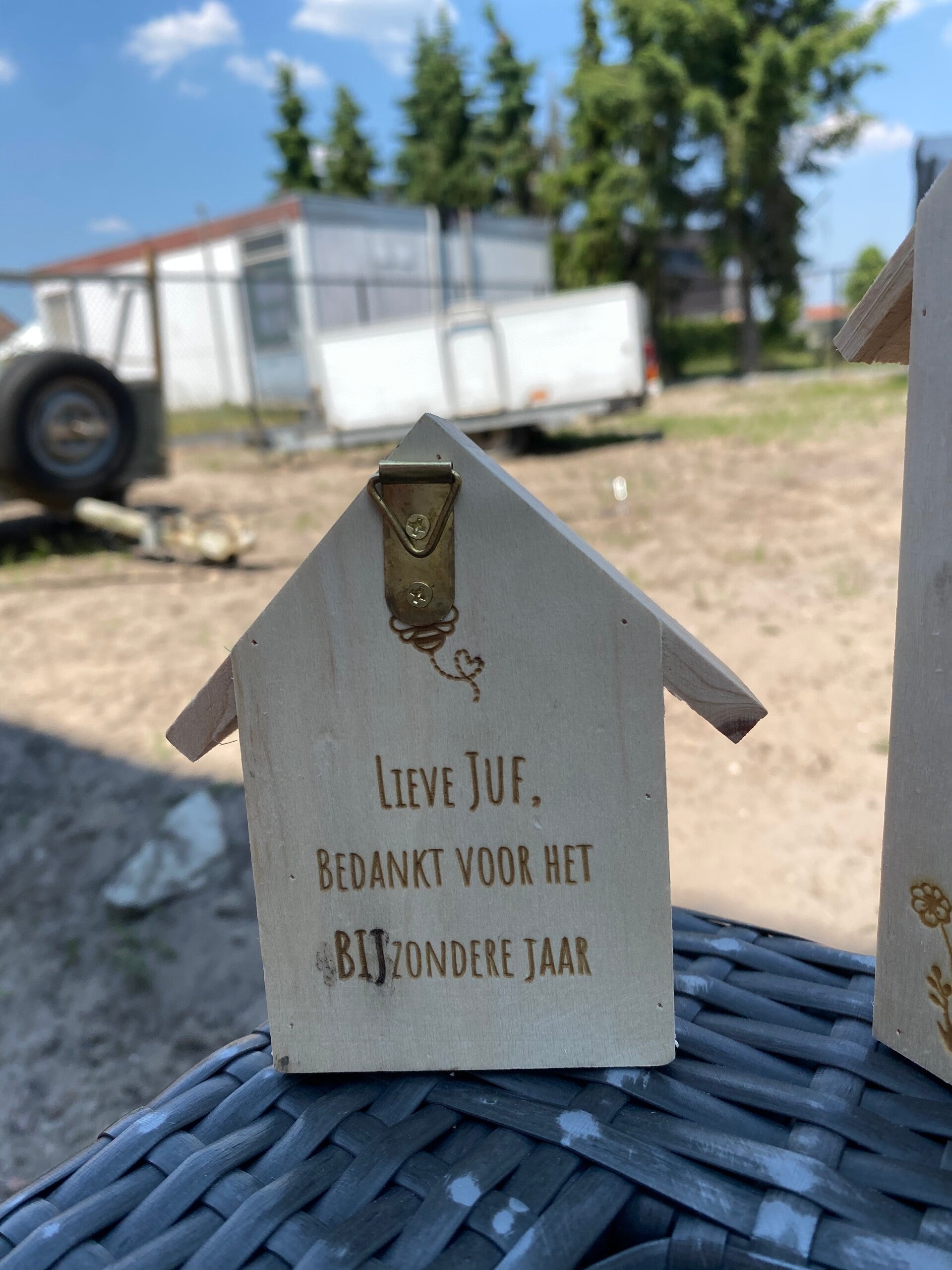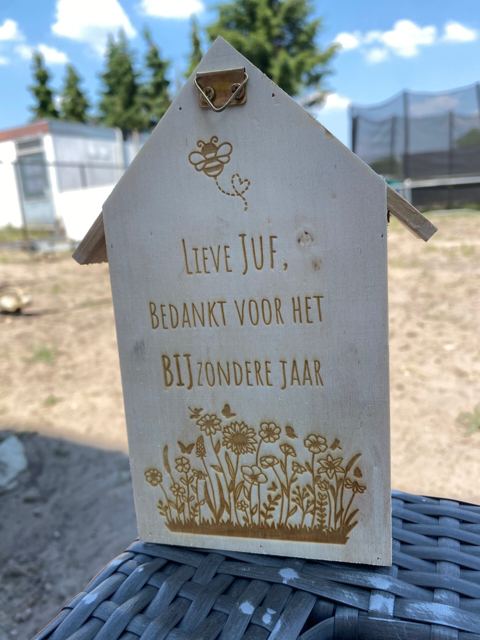 Insectenhotel met tekst: Juf Bedankt voor het BIJzondere jaar.