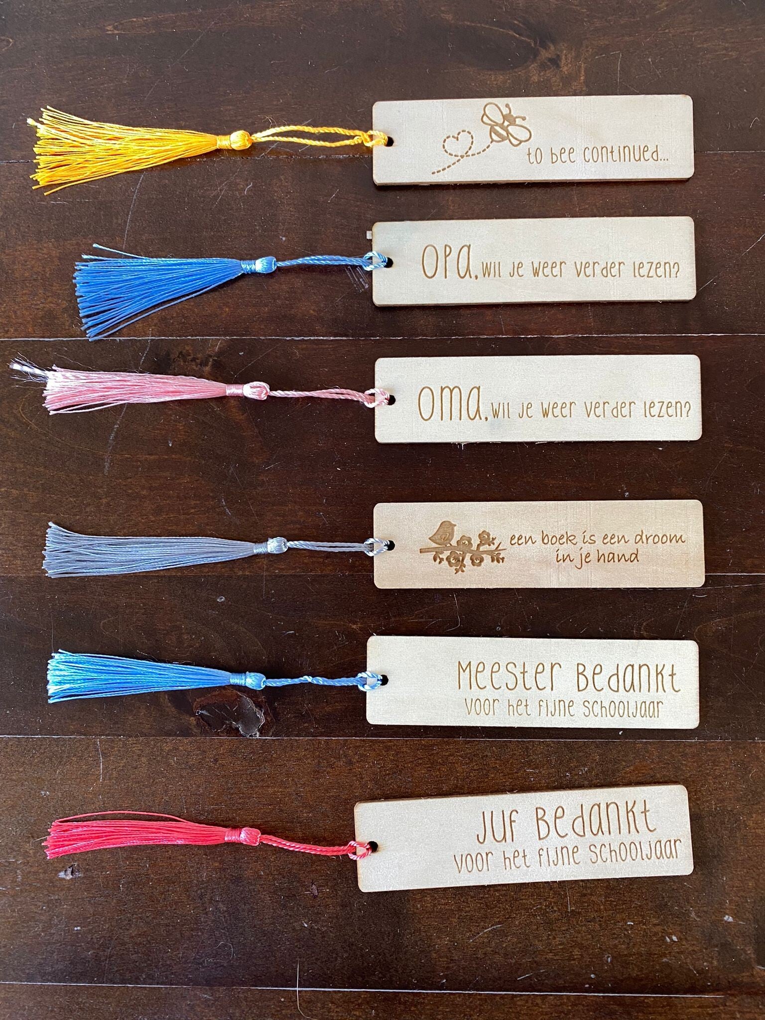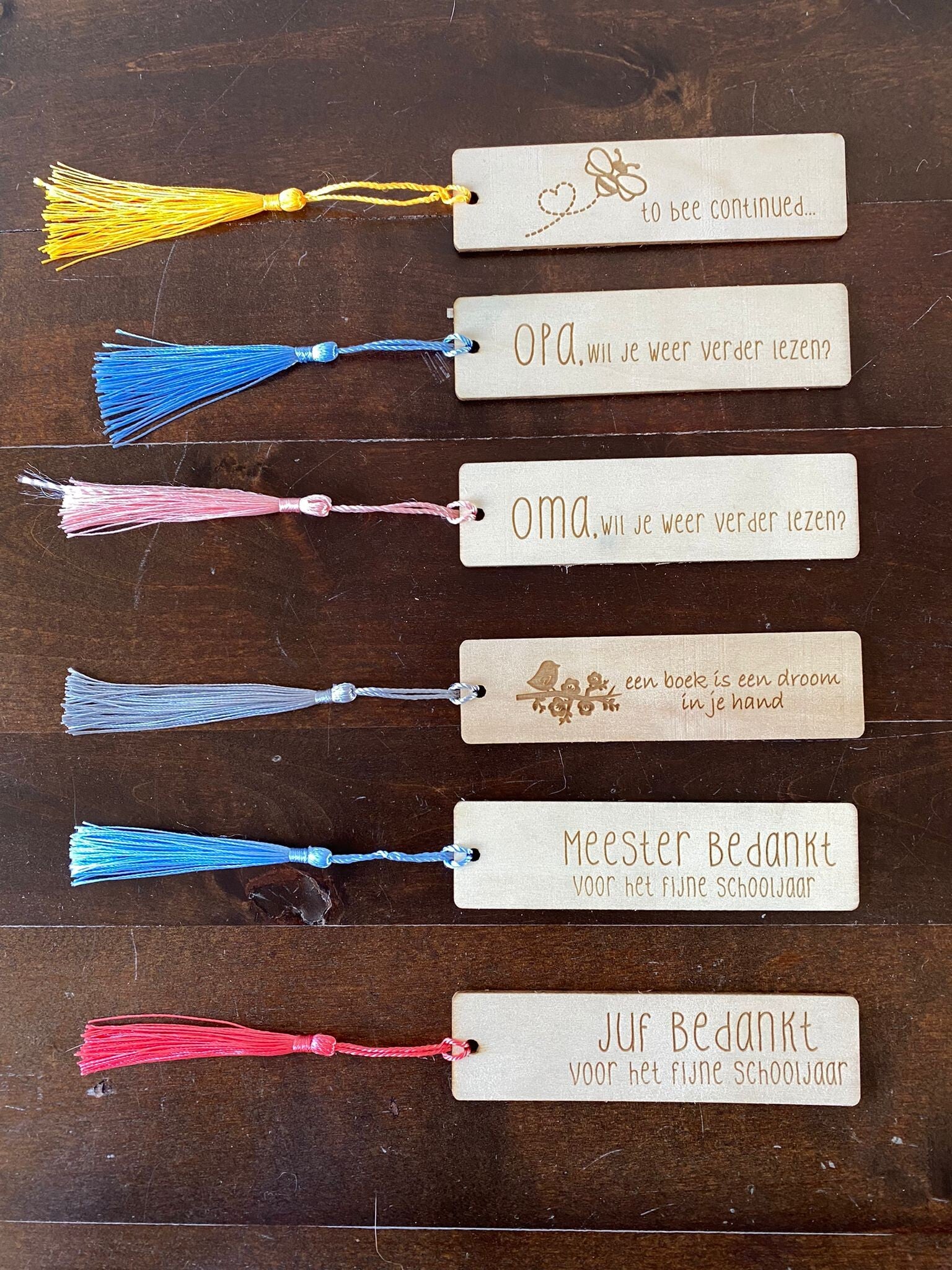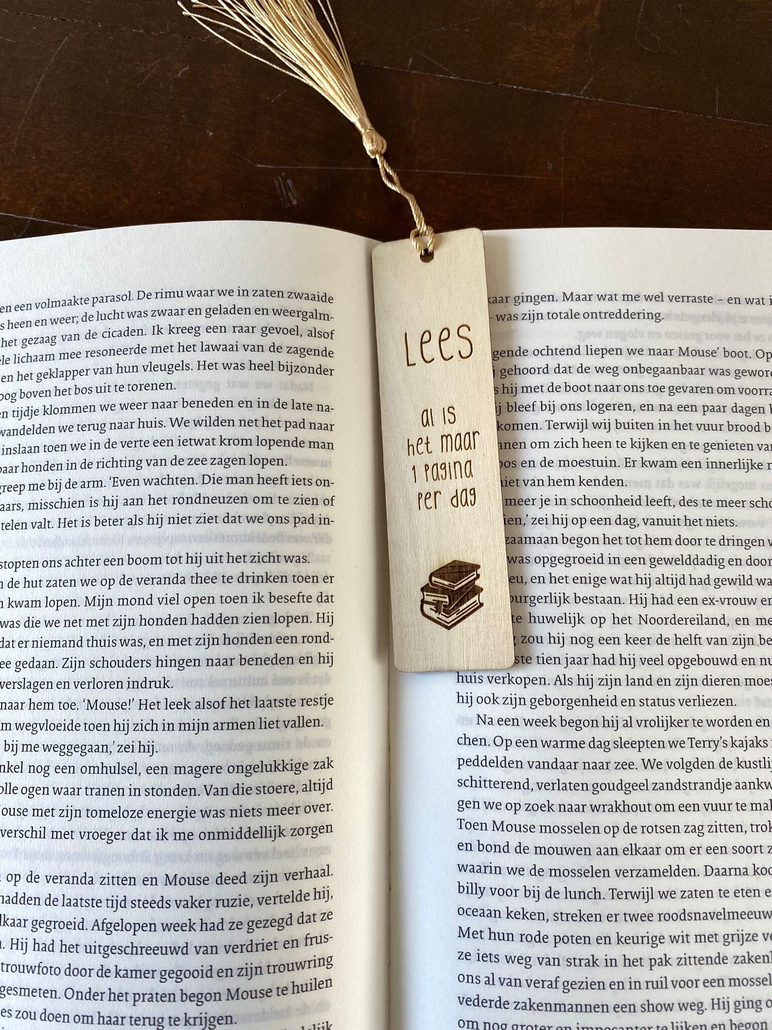 Houten Boekenlegger met tekst: METIE, wil je weer verder lezen?