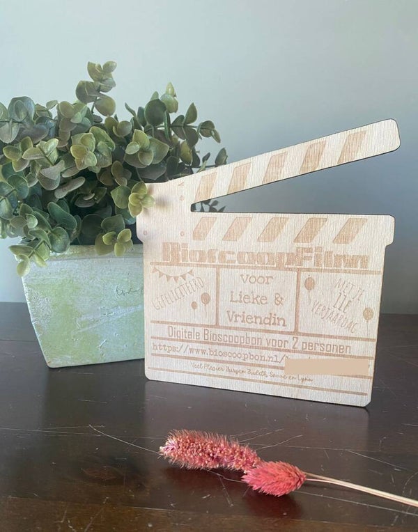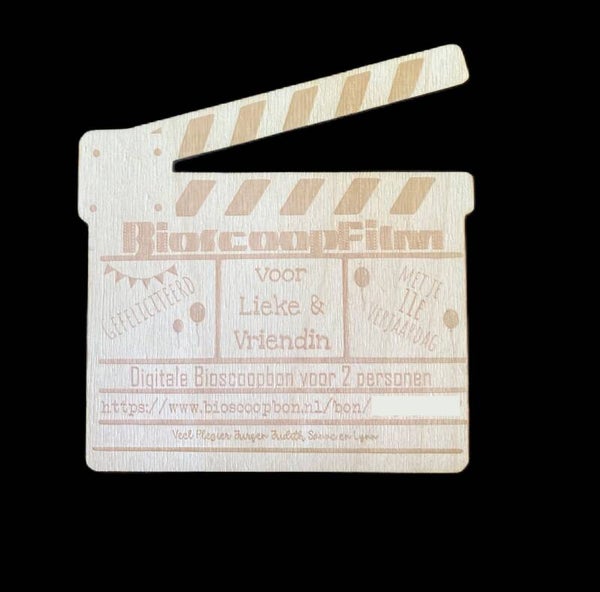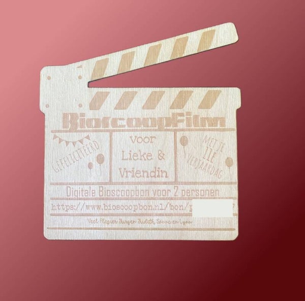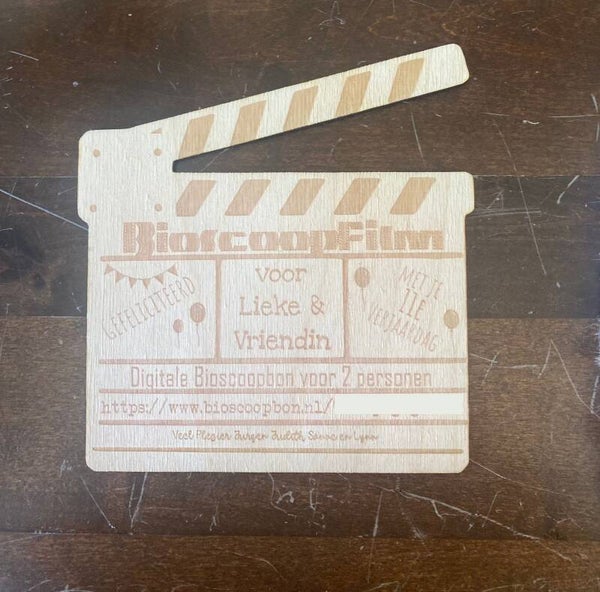 Letop. We kunnen voor de Nederlandse bioscoopbonnen (van de Nationale Bioscoopbon) een code aanmaken zodat je deze direct op het hout kunt laten graveren.