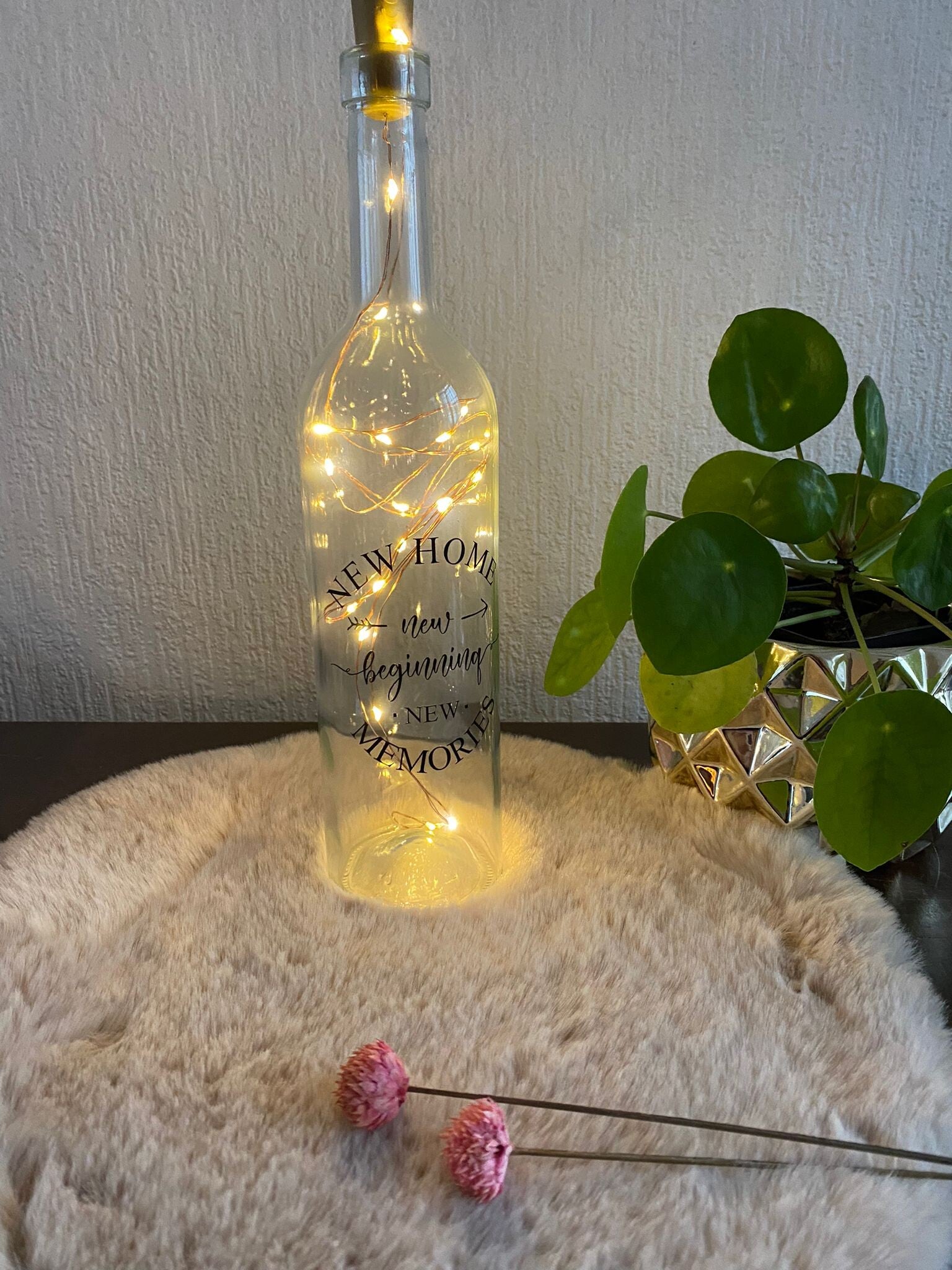 Lichtfles met tekst: "Anew home, new beginning & new memomies"