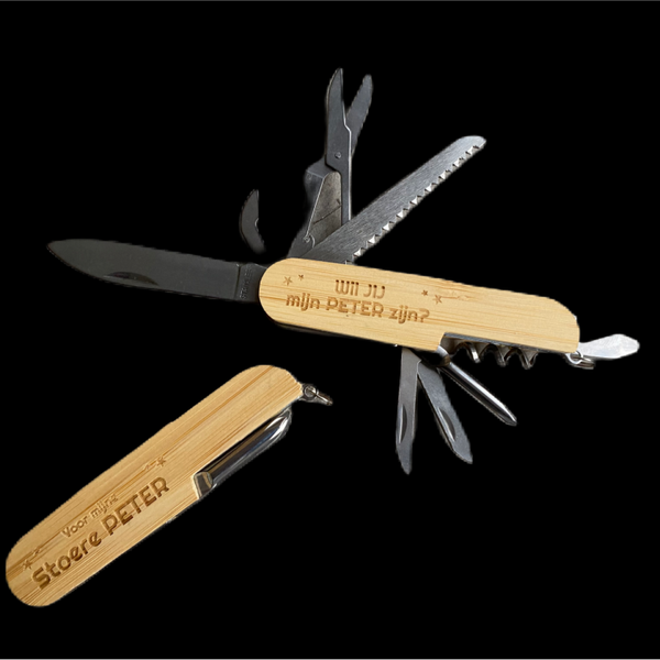 Een zakmes met tekst naar keuze. Een heel origineel en handig cadeau wat de persoon waar het aan geeft steeds opnieuw kan gebruiken.