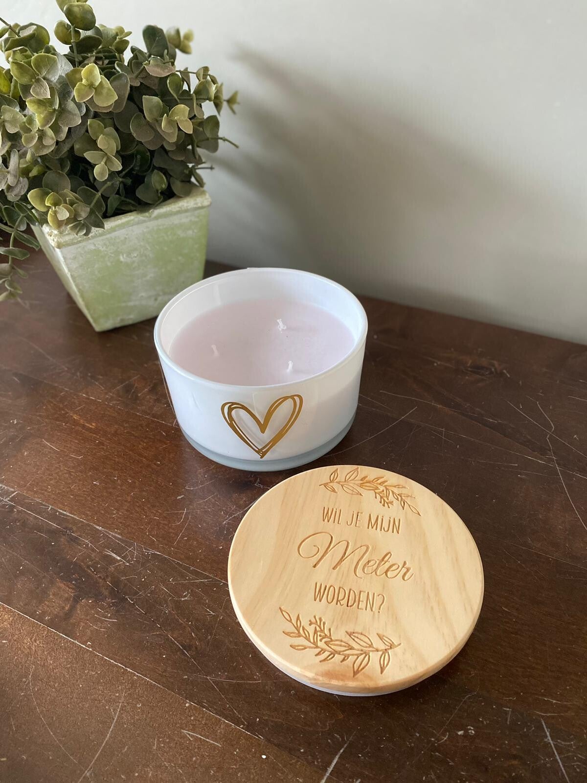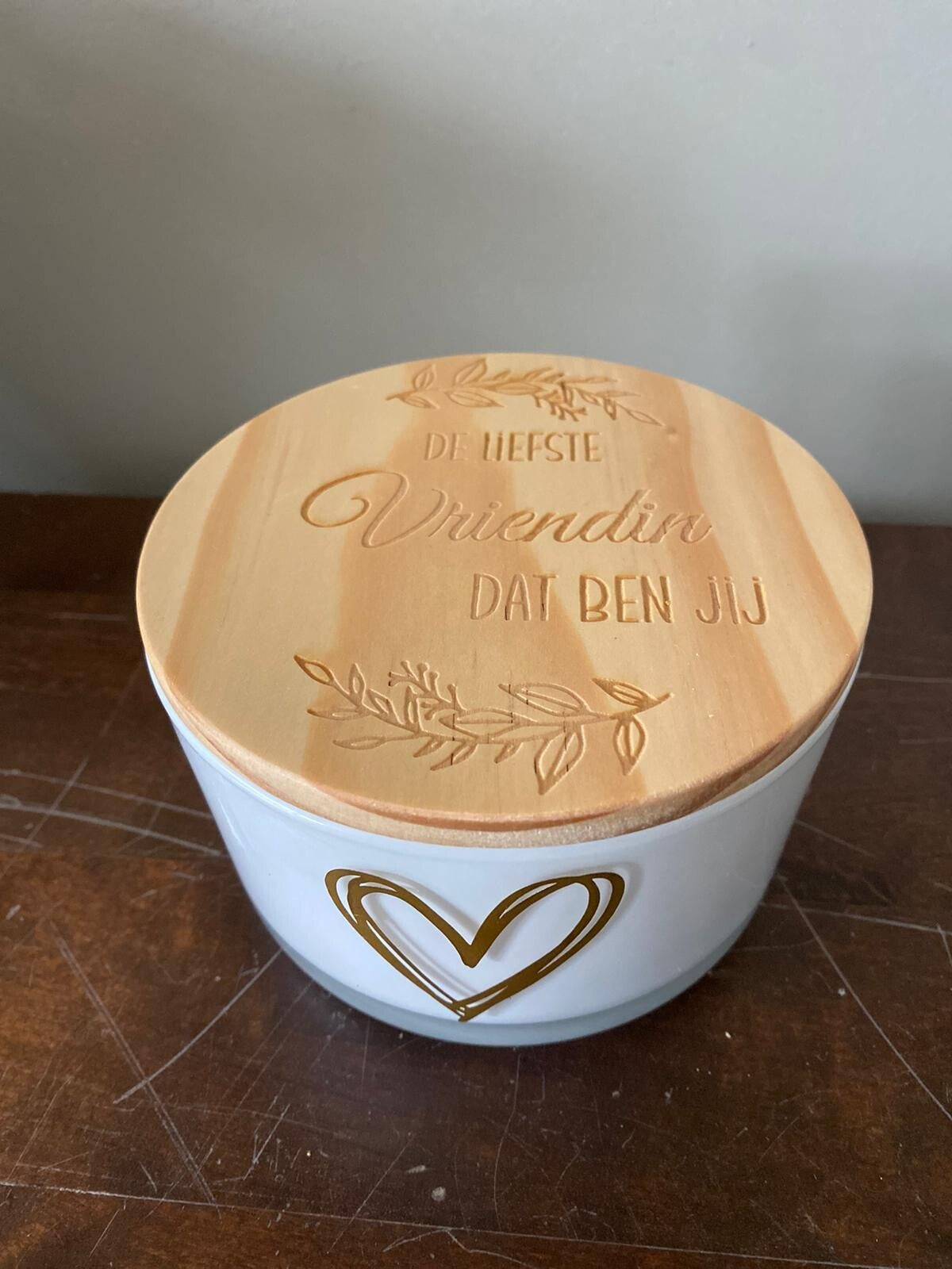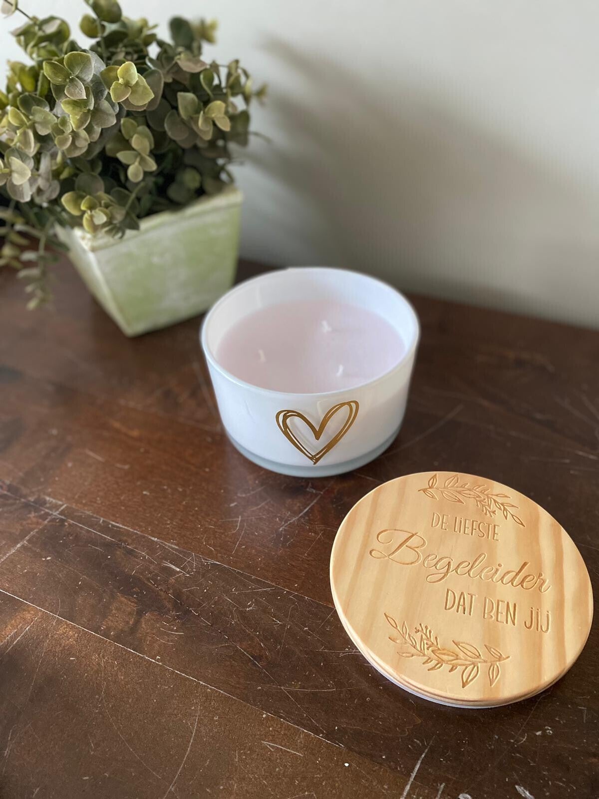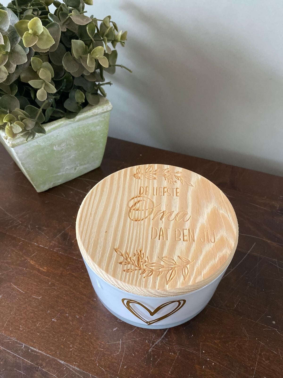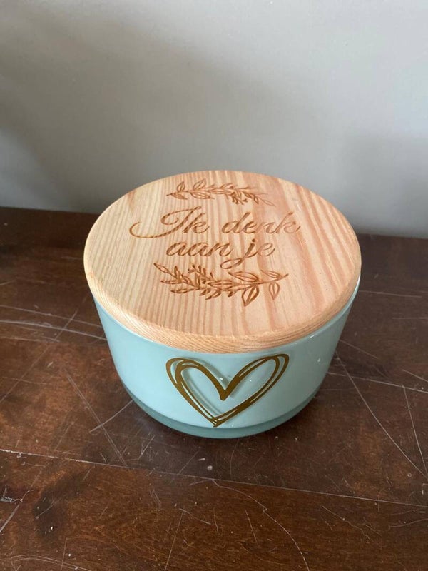 Kaars met houten deksel met tekst
