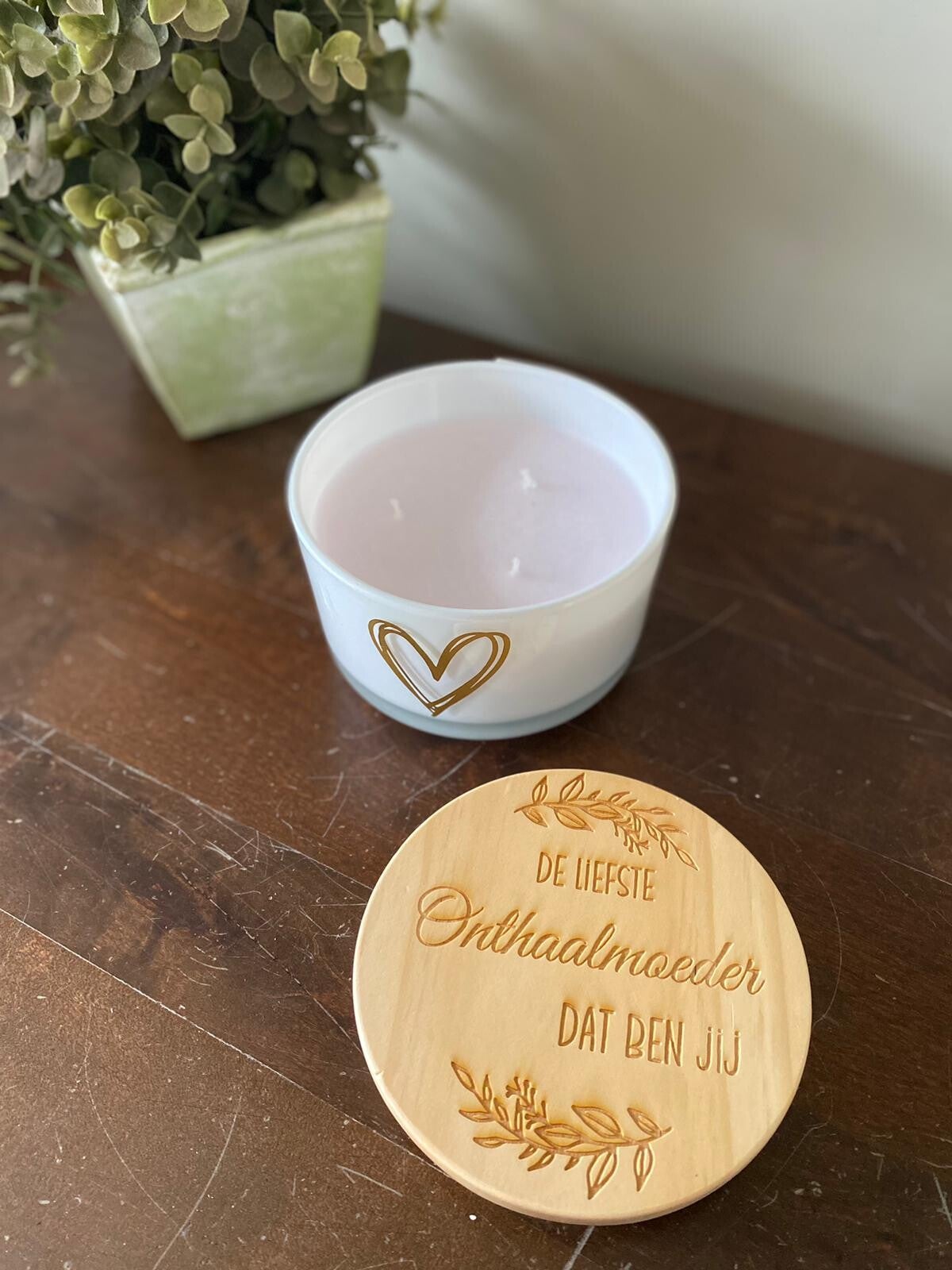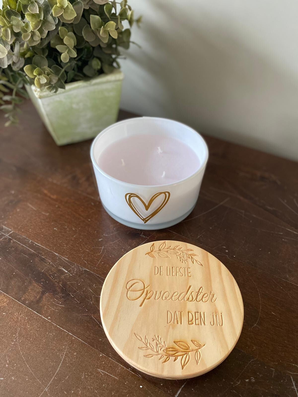 Onze luxe geurkaars met houten deksel is een ware blikvanger in elk interieur. Met een doorsnede van ongeveer 12 cm en drie lonten, biedt deze kaars een gelijkmatige, langdurige verbranding en vult elke ruimte met een heerlijke geur. Het stijlvolle houten deksel kan gepersonaliseerd worden met een tekst of bedrijfslogo, wat deze kaars perfect maakt als cadeau of relatiegeschenk. Dankzij het natuurlijke en tijdloze design past deze kaars moeiteloos in elke woonstijl. Een combinatie van elegantie, sfeer en een persoonlijk tintje voor speciale momenten.