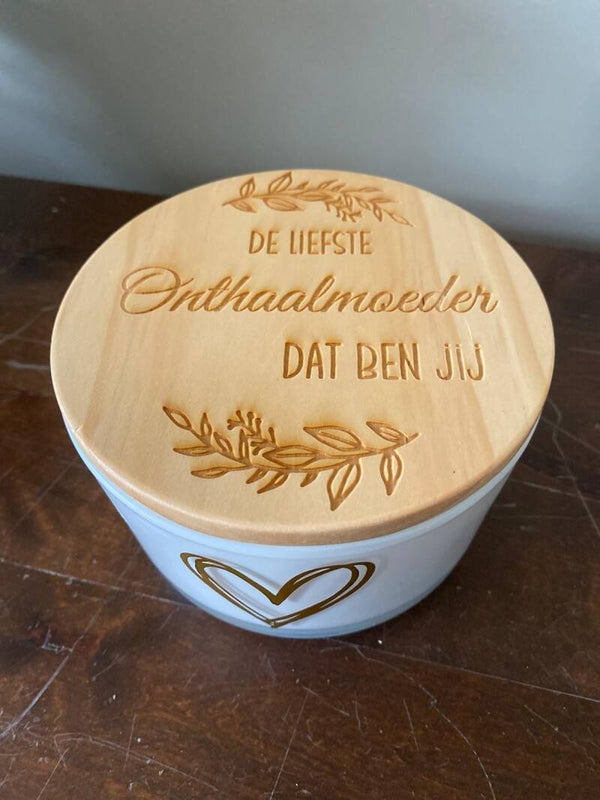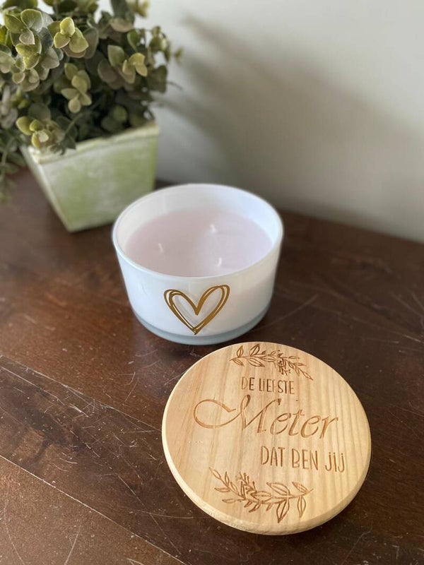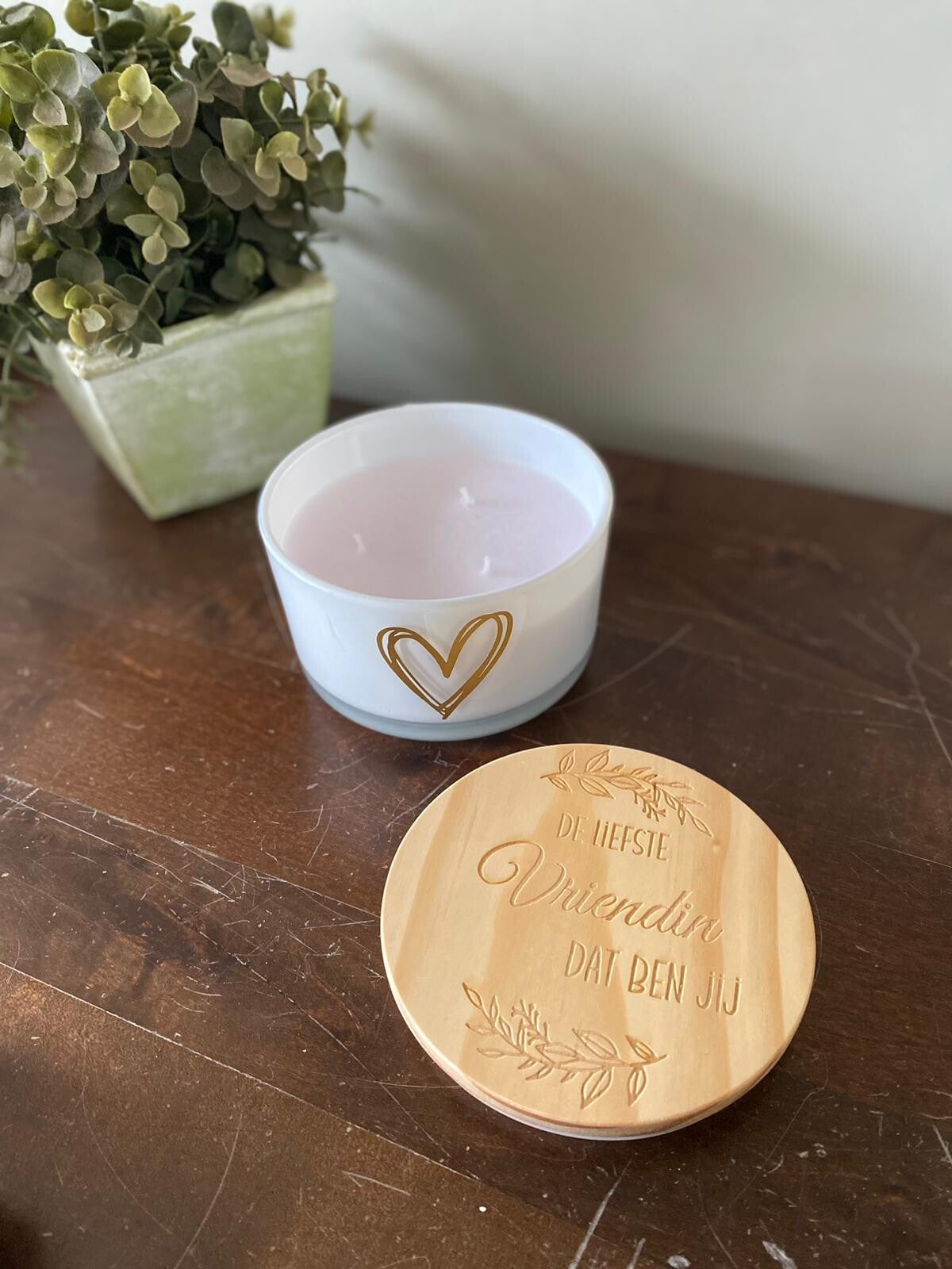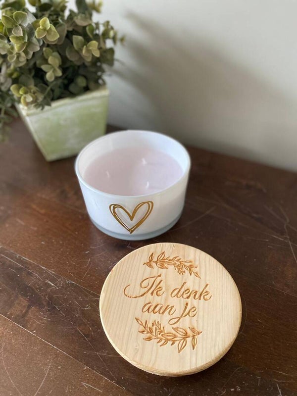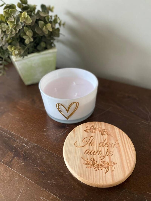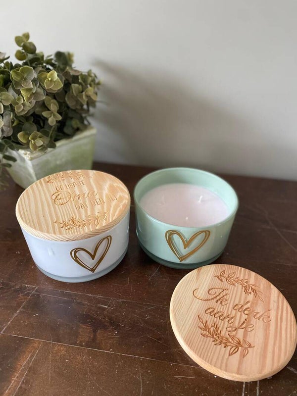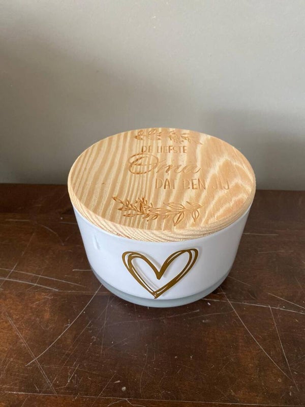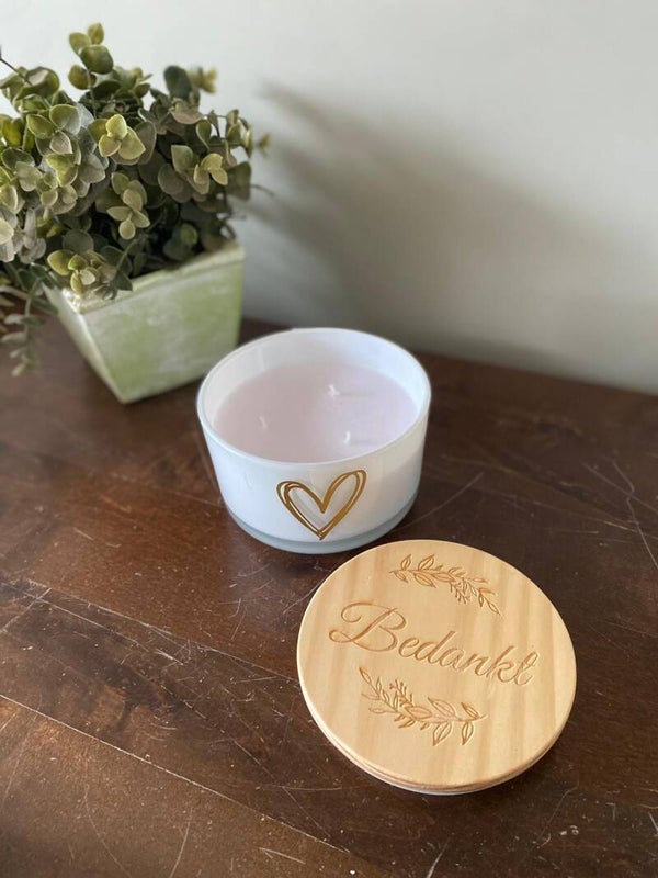Onze luxe geurkaars met houten deksel is een ware blikvanger in elk interieur. Met een doorsnede van ongeveer 12 cm en drie lonten, biedt deze kaars een gelijkmatige, langdurige verbranding en vult elke ruimte met een heerlijke geur. Het stijlvolle houten deksel kan gepersonaliseerd worden met een tekst of bedrijfslogo, wat deze kaars perfect maakt als cadeau of relatiegeschenk. Dankzij het natuurlijke en tijdloze design past deze kaars moeiteloos in elke woonstijl. Een combinatie van elegantie, sfeer en een persoonlijk tintje voor speciale momenten.