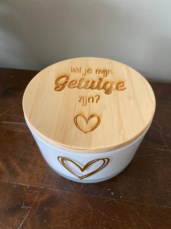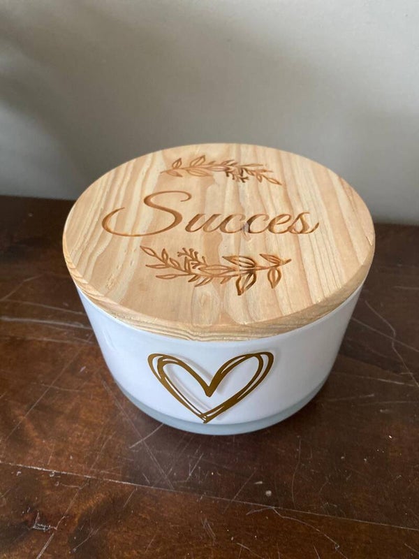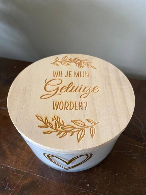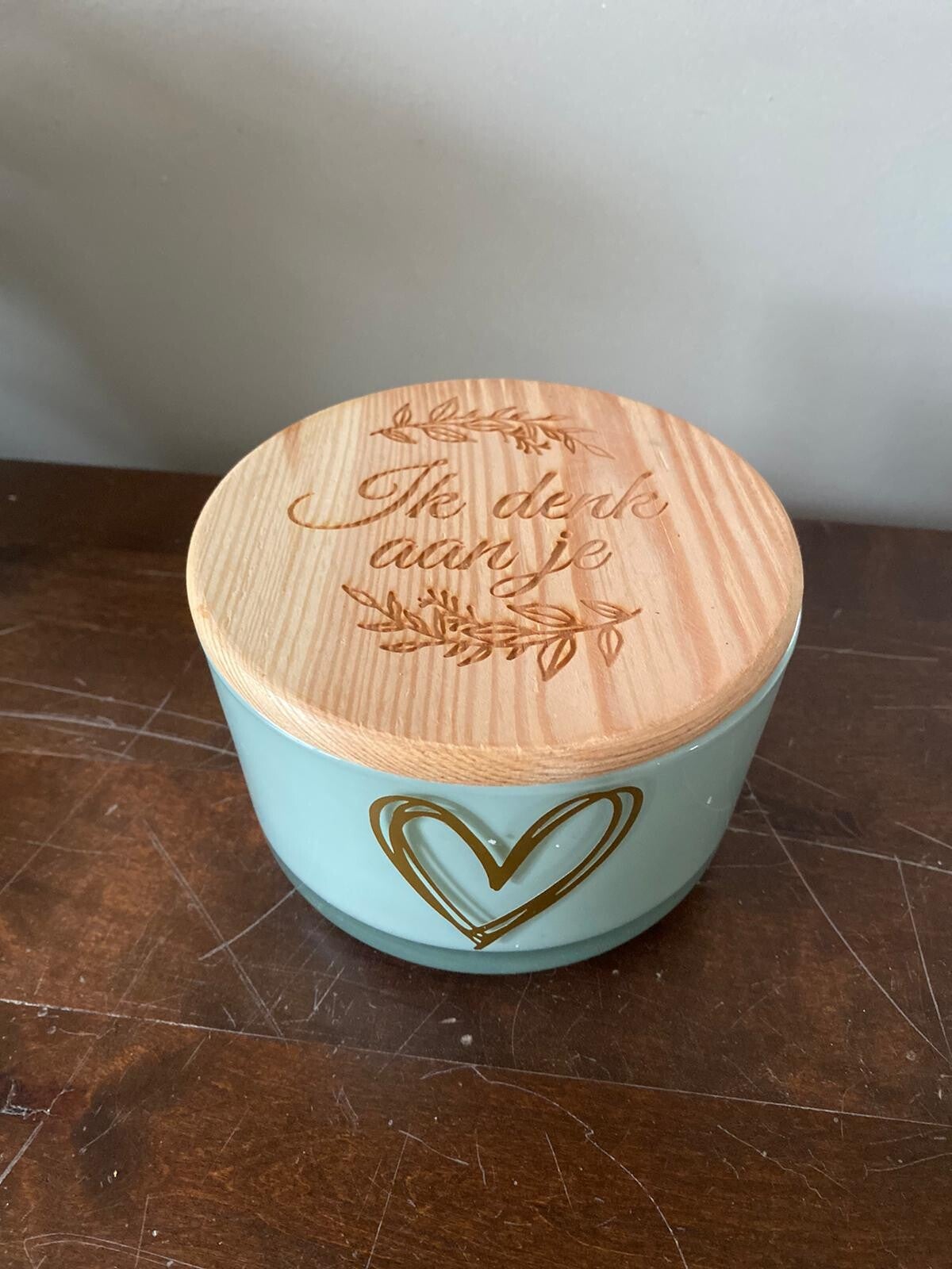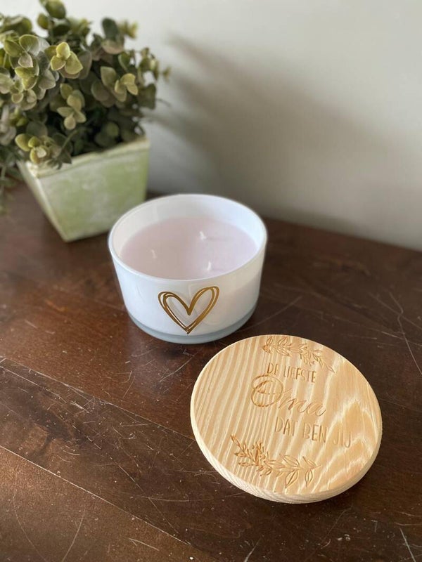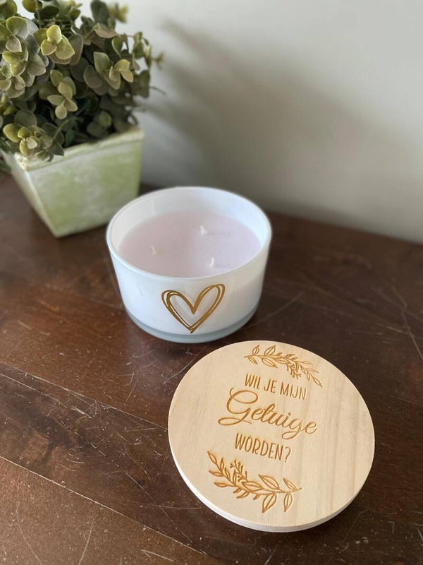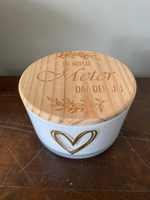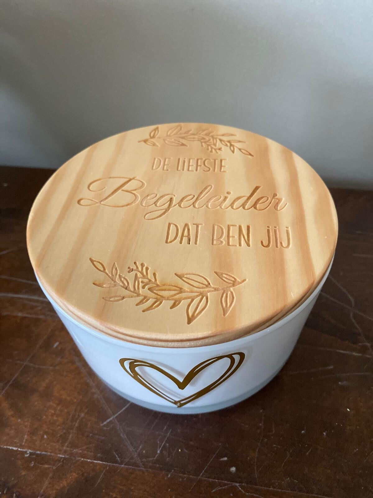 Onze luxe geurkaars met houten deksel is een ware blikvanger in elk interieur. Met een doorsnede van ongeveer 12 cm en drie lonten, biedt deze kaars een gelijkmatige, langdurige verbranding en vult elke ruimte met een heerlijke geur. Het stijlvolle houten deksel kan gepersonaliseerd worden met een tekst of bedrijfslogo, wat deze kaars perfect maakt als cadeau of relatiegeschenk. Dankzij het natuurlijke en tijdloze design past deze kaars moeiteloos in elke woonstijl. Een combinatie van elegantie, sfeer en een persoonlijk tintje voor speciale momenten.