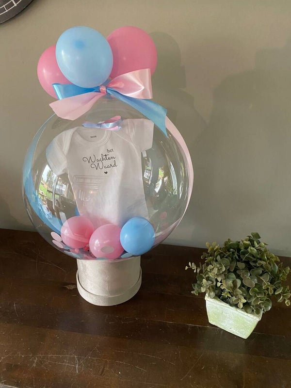 Geplaatst op een doos en voorzien van lint met een strik en afgewerkt met ballonnen op de top.
