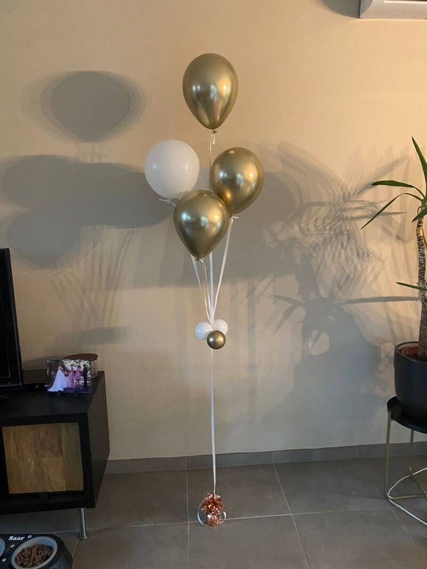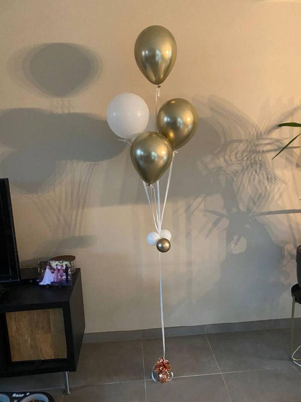 Deze kant-en-klare set bestaat uit vijf heliumballonnen met een ballongewichtje. Met een indrukwekkende hoogte van ongeveer 2 meter en een diameter van 30 cm per ballon, zijn ze de perfecte eyecatcher. De ballonnen zijn gemaakt van 100% biologisch afbreekbaar latex, en je kiest zelf de kleuren met behulp van het handige kleurenpalet op de foto.