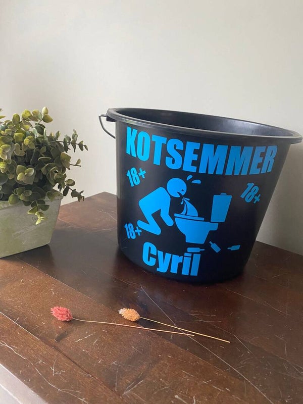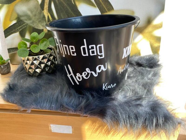 Zwarte kotsemmer gepersonlaiseerd met naam.
