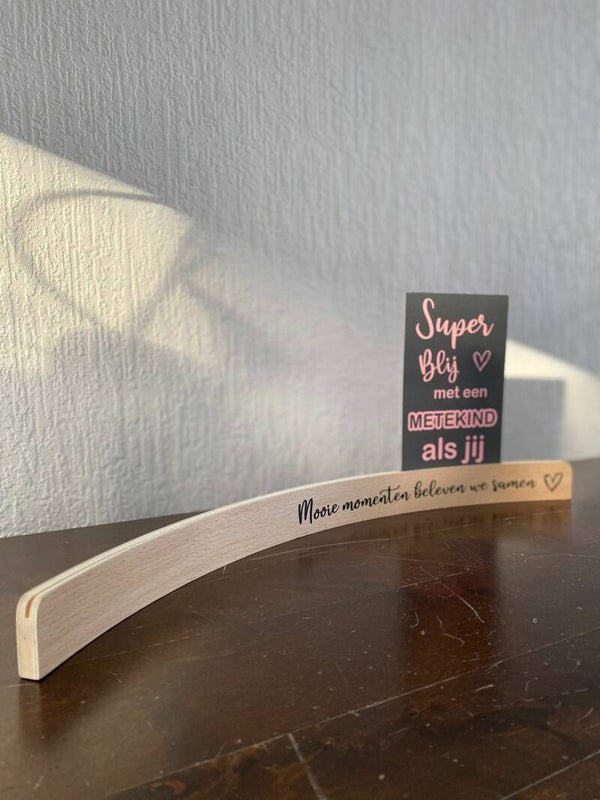 Een houten fotostandaard van ongeveer 50 cm breed en 5 cm hoog is een boogvorm.