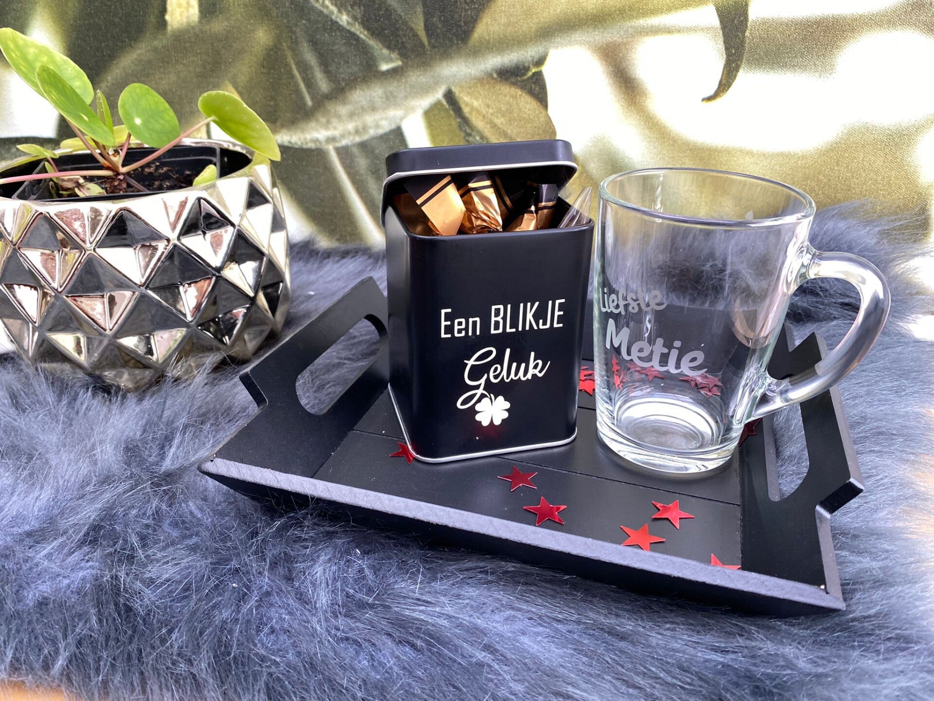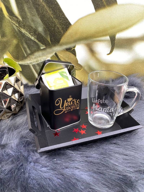 Giftset: Houten dienblad met een blikje geluk gevuld met lekkere voorverpakte pralines en een theeglas met een naam naar keuze.