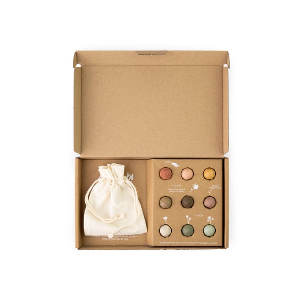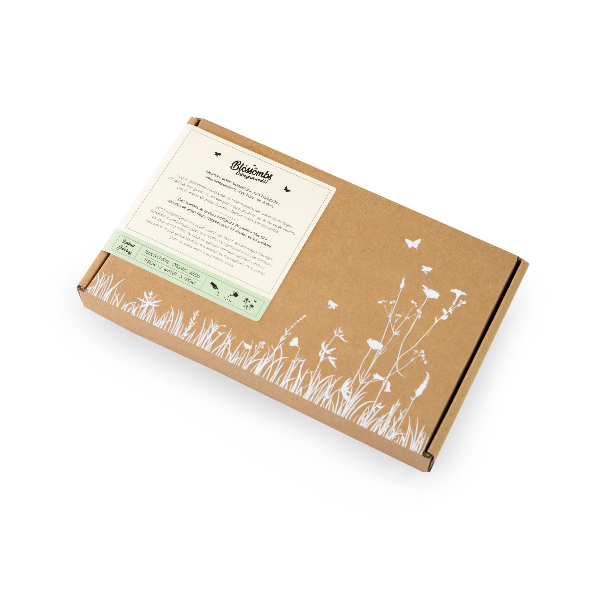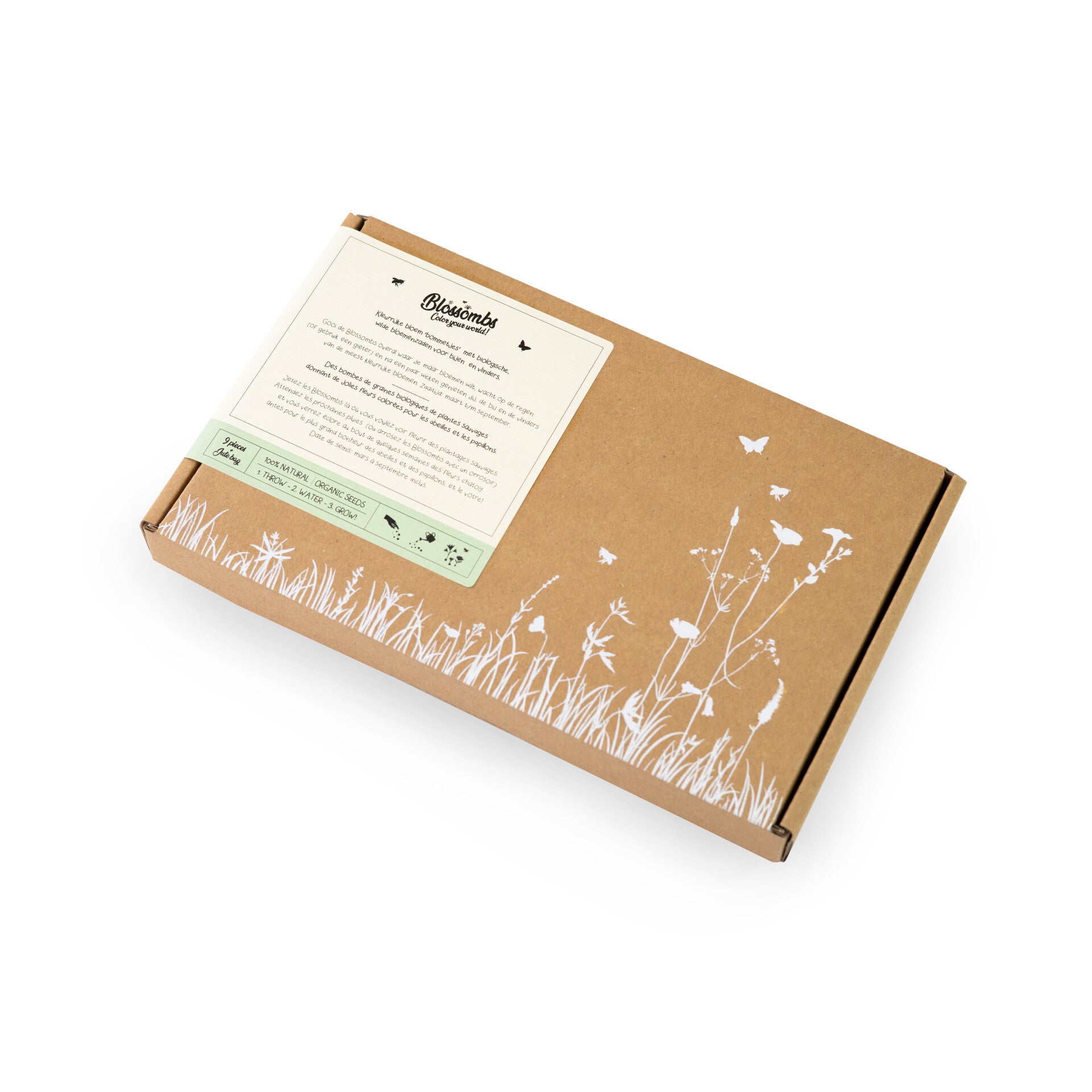 Een grote luxe geschenkdoos met 9 Blossombs zaadbommetjes en een biologisch jute bewaarzakje. Perfect om cadeau te geven of op afstand toe te sturen, want de giftbox large past door de brievenbus!
