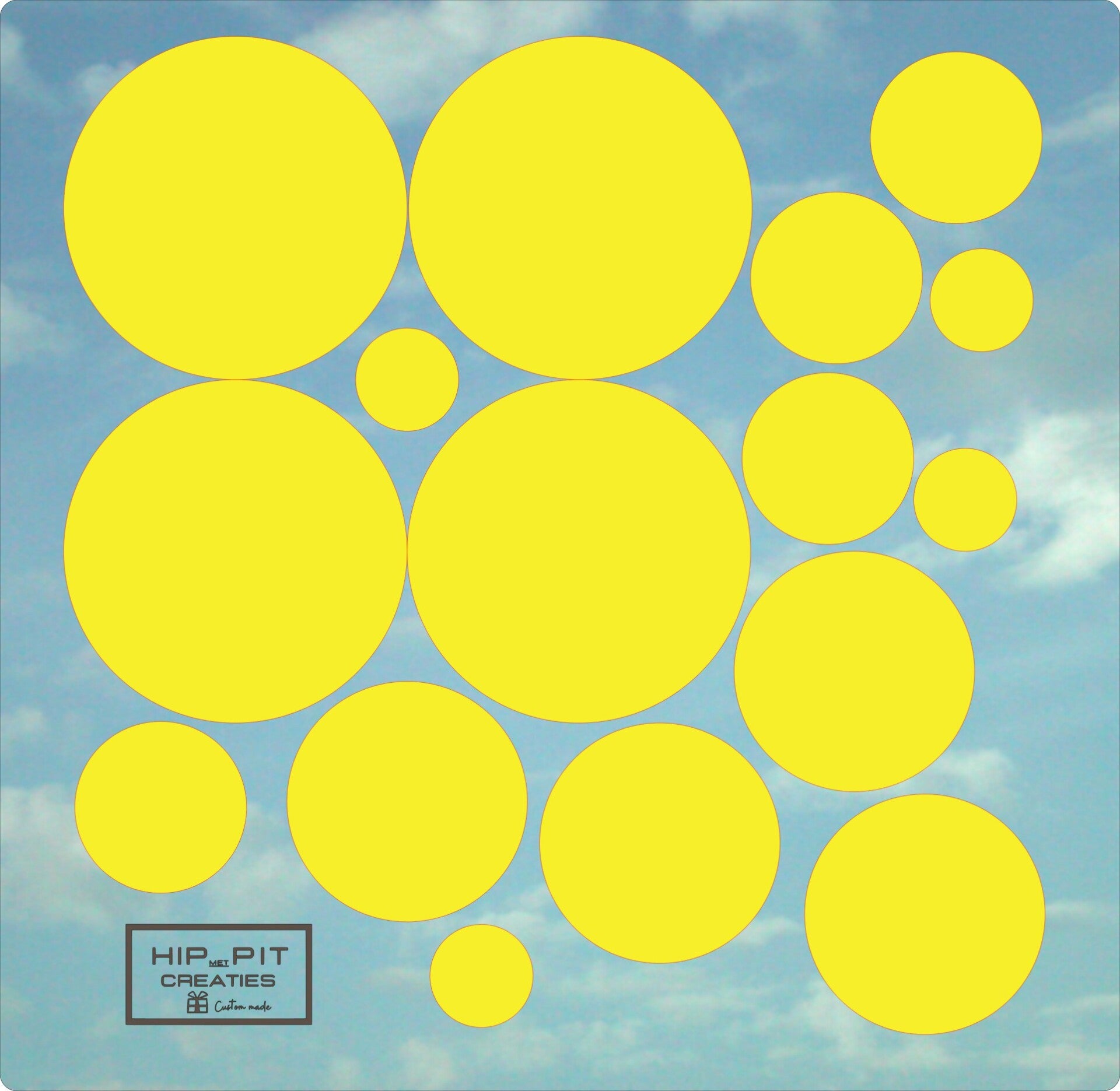 Er zijn verschillende sets beschikbaar. Iedere set is een blad van 30x30cm vol met stickers in diverse maten: 3cm 5 cm en/ of 7cm