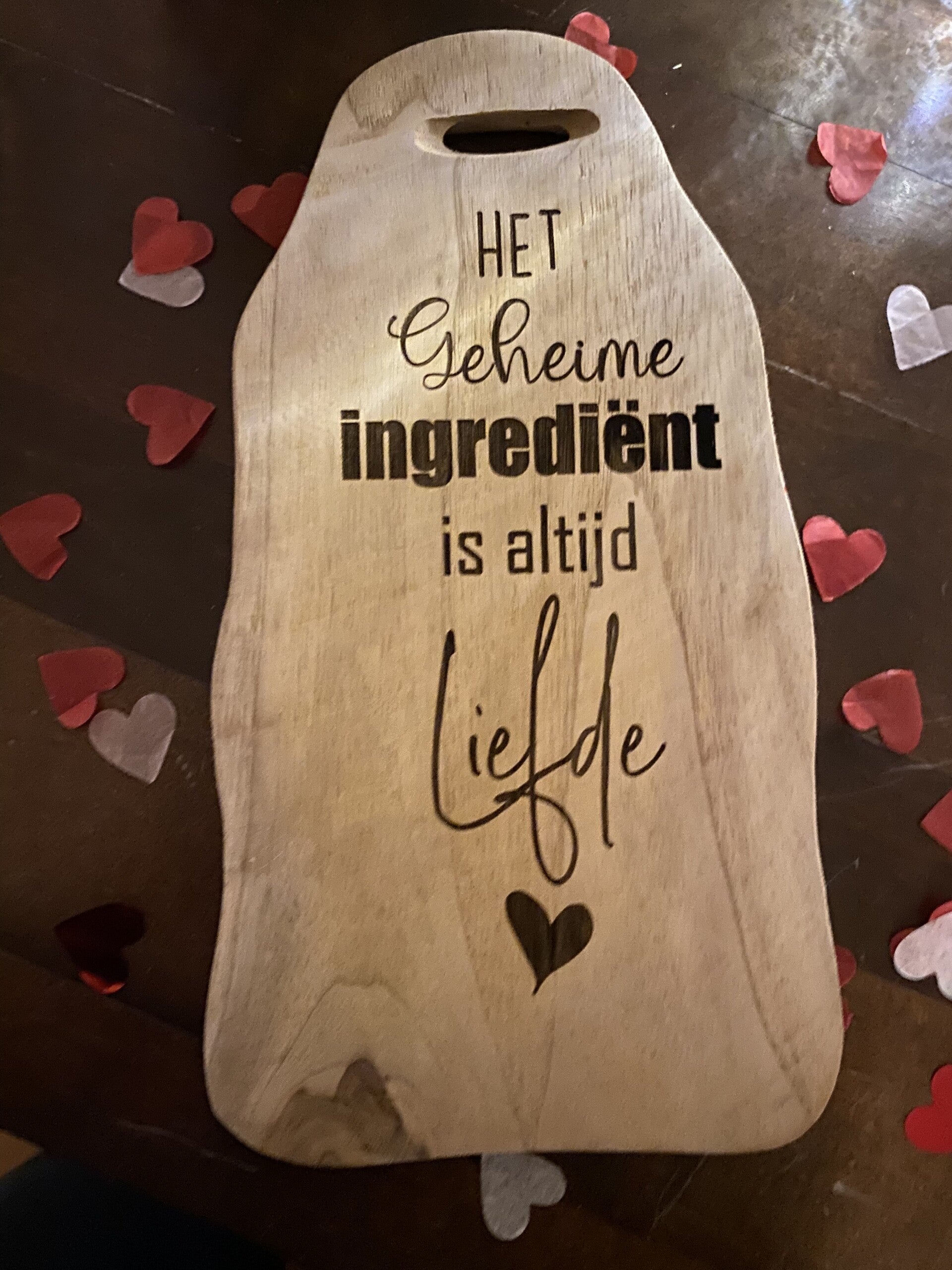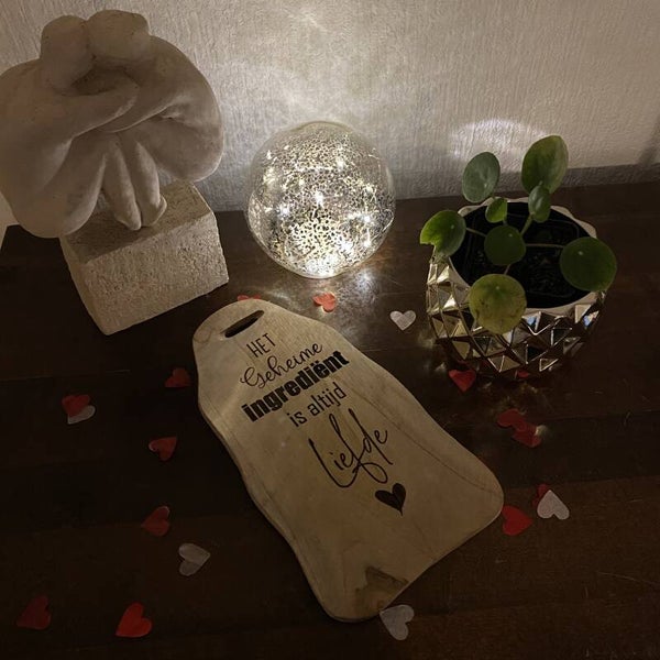 Een houten tapas plankje van 15x30cm ongeveer. tekst: het geheime ingrediënt is altijd liefde.