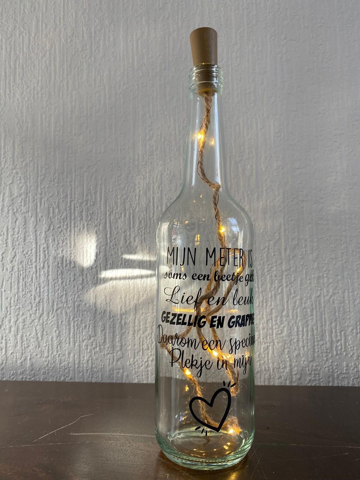 Een lichtfles geeft veel sfeer in huis en laat een mooie tekst of opdruk tot leven komen.