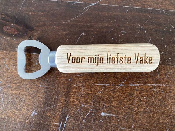 Houten (bier-) flesopener met een tekst of opdruk naar keuze.