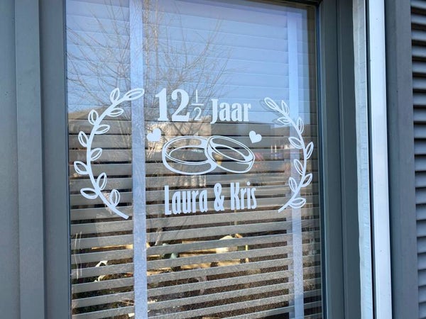 Raamsticker 12,5 jaar getrouwd met namen en ringen