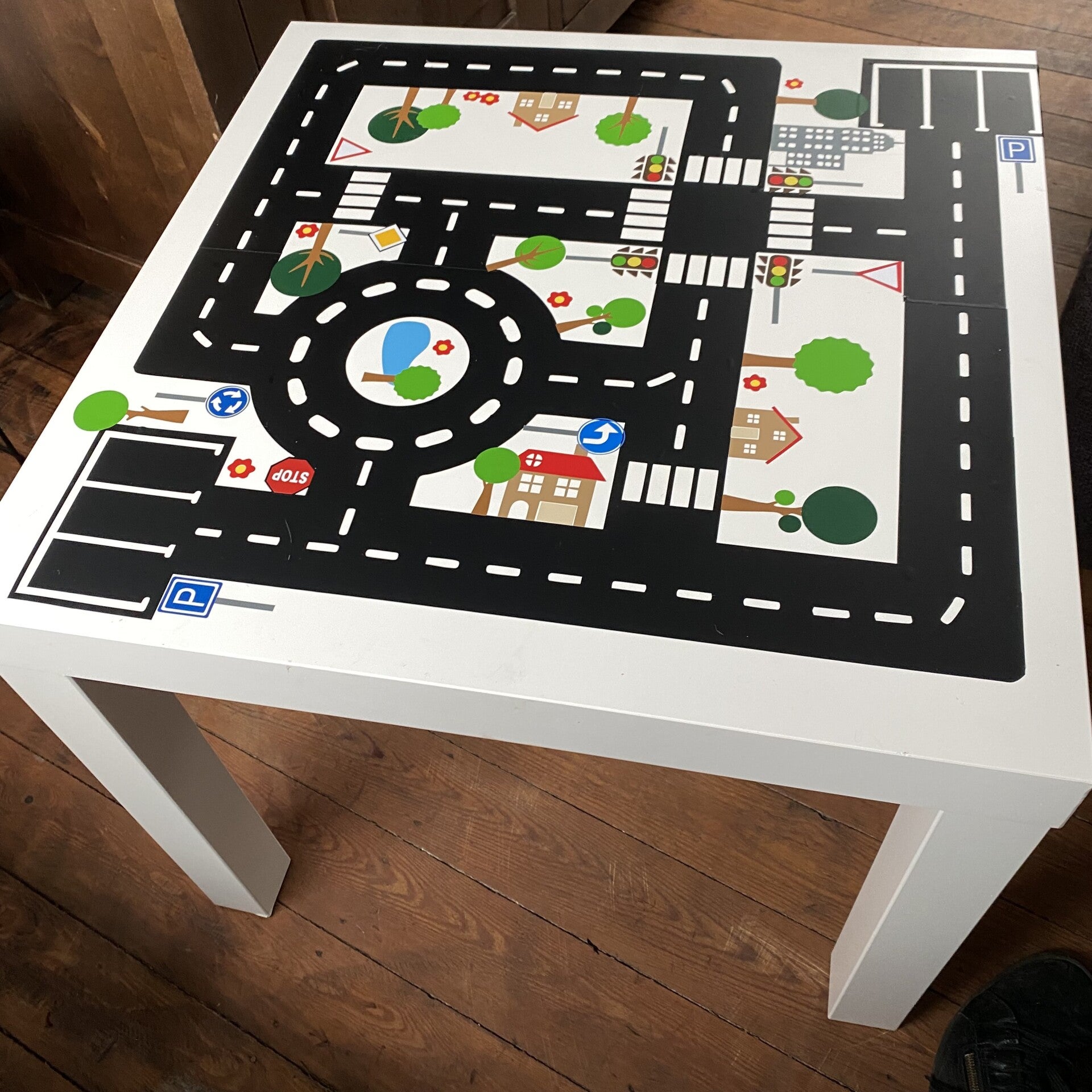 Autobaan tafel met 2 auto's meegeleverd in potje eventueel te bevestigen aan de onderkant vzn de tafel.