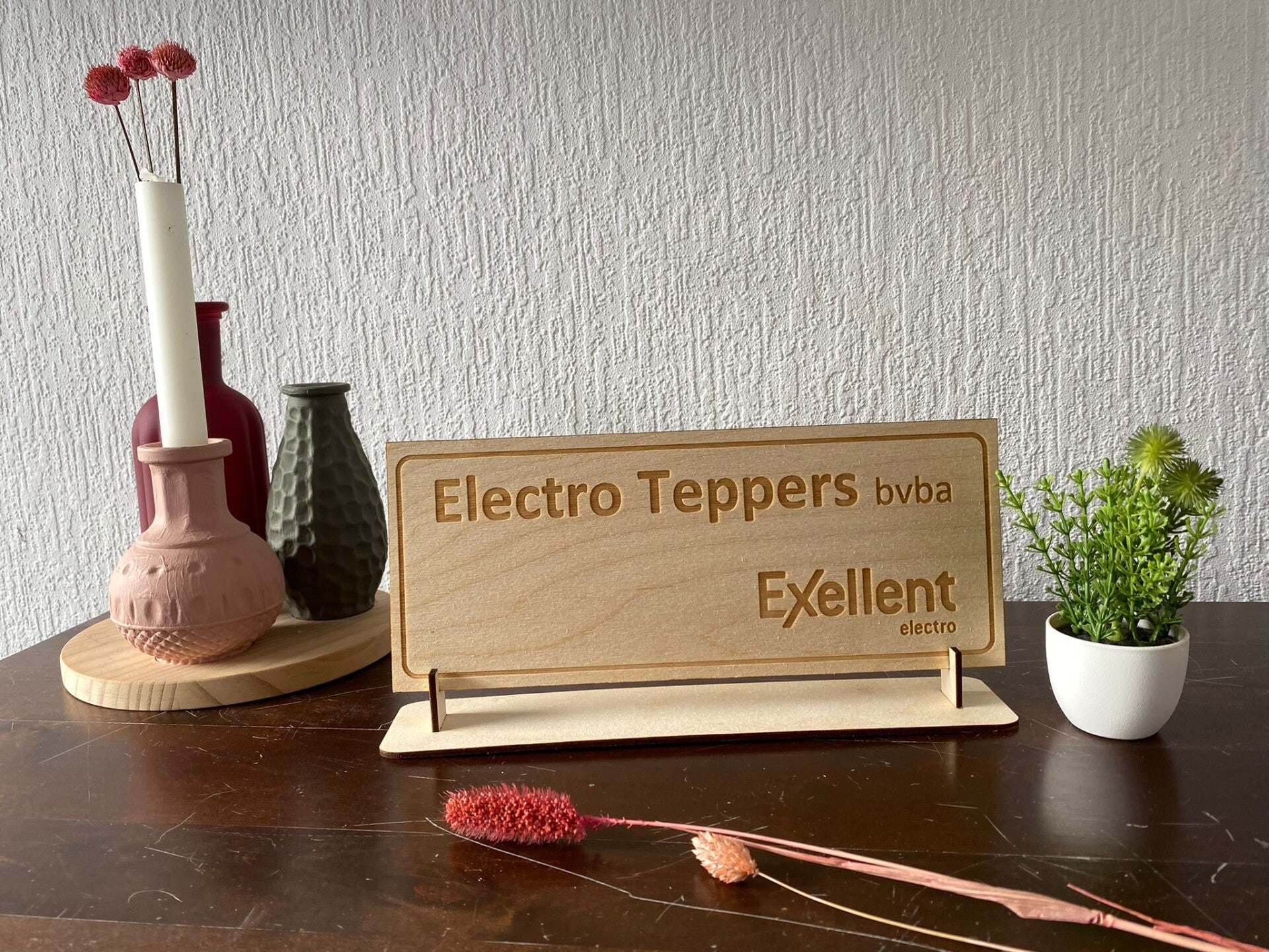 Houten bordje met bedrijfslogo