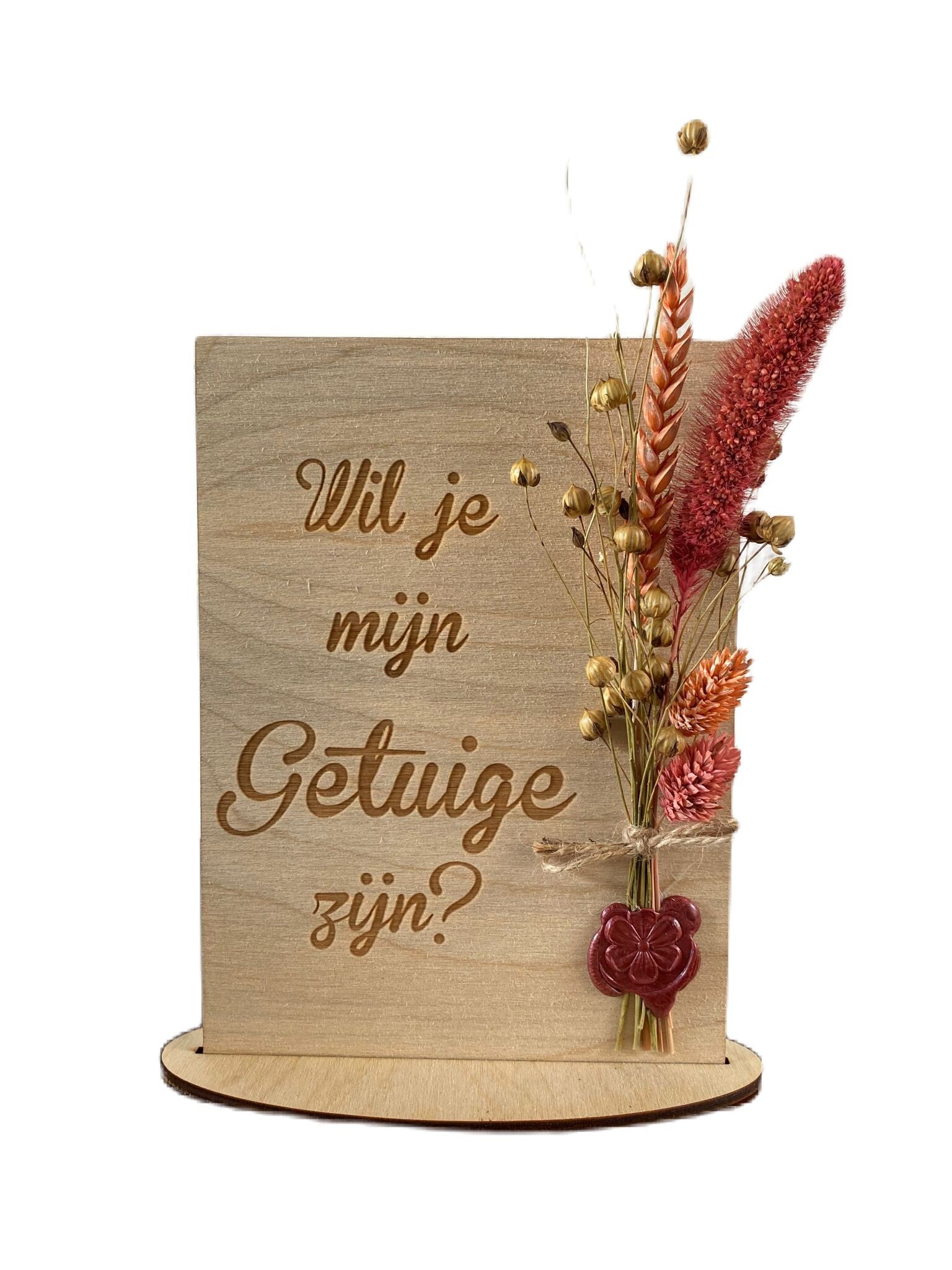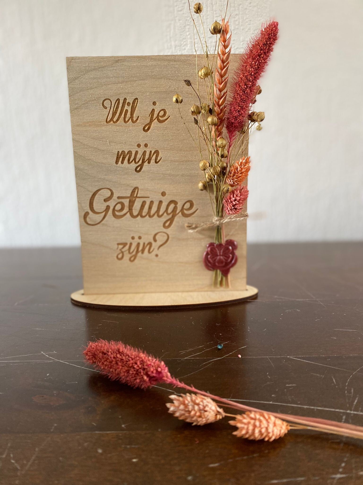 Wij maken mooie houten kaarten in een standaard met droogbloemen Wil je mijn Getuige zijn?