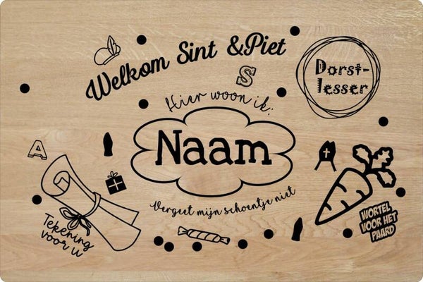 Deze houten onderzetter verwelkomt sint en piet als de kinderen hun schoen mogen zetten. Er is plaats voor een wortel voor het paard, een drankje en een mooie tekening.