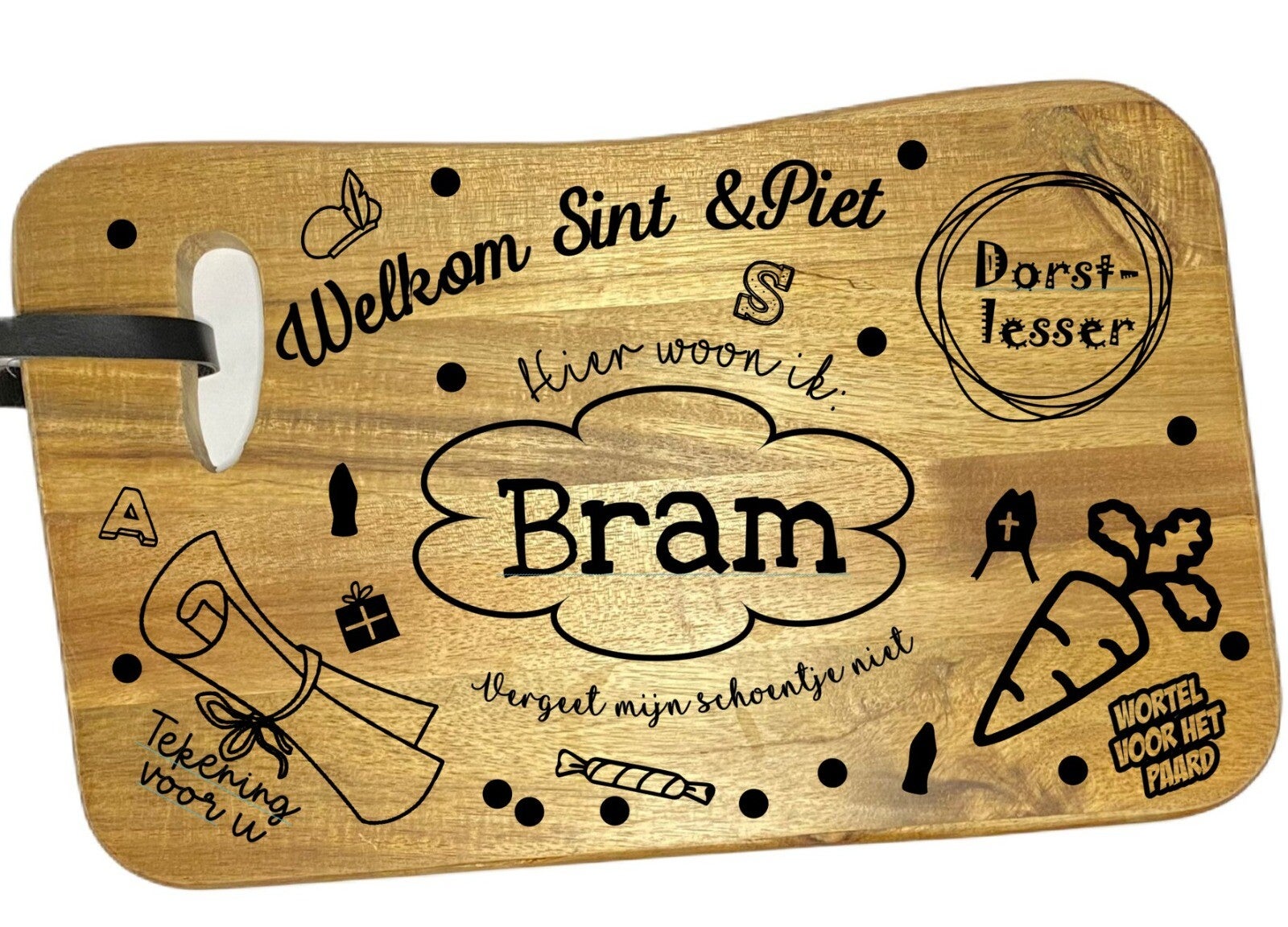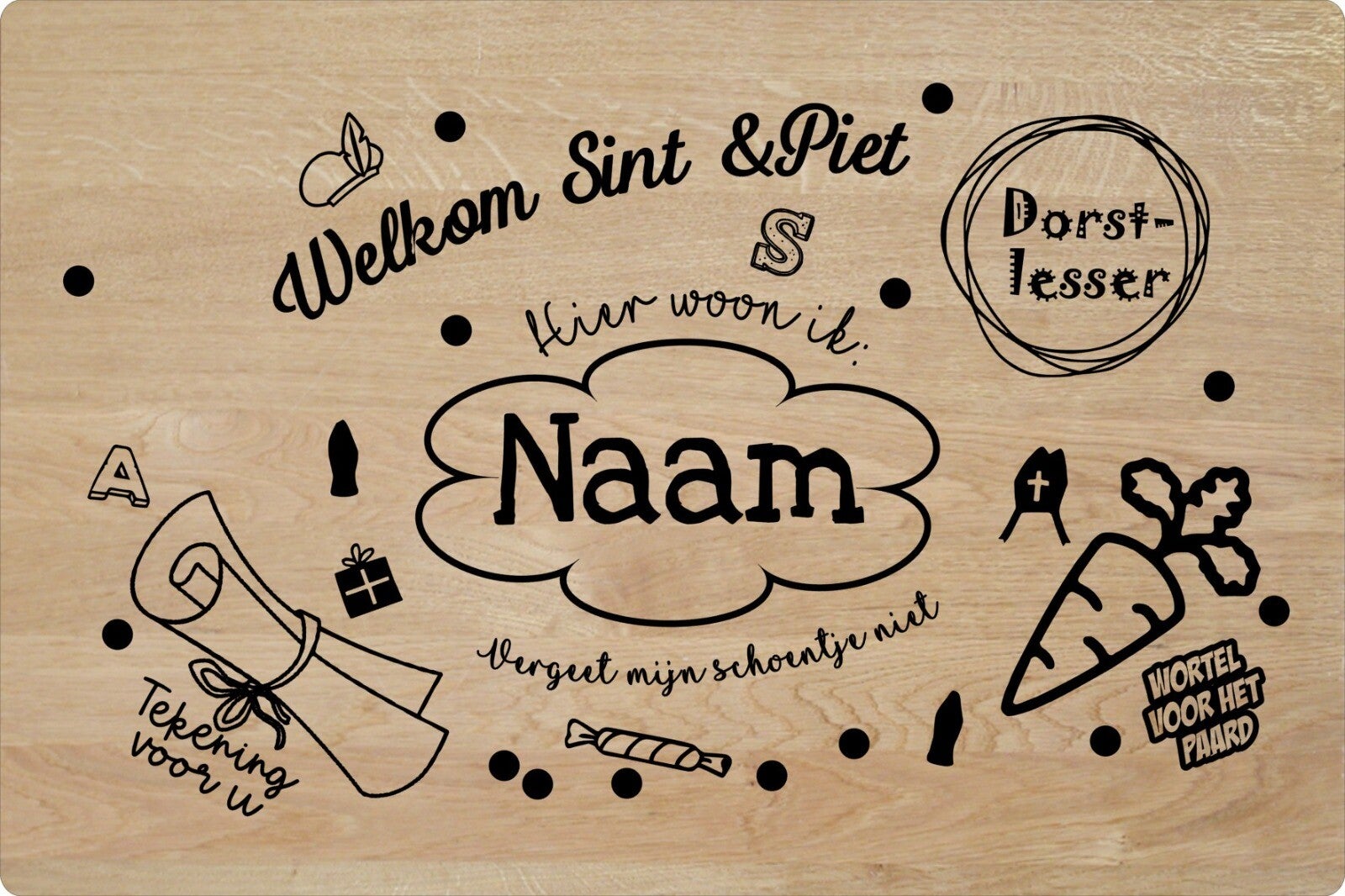 Geef dus de naam van het kind door en we plaatsen deze in het midden van de houten onderzetter: Welkom Sint en Piet.